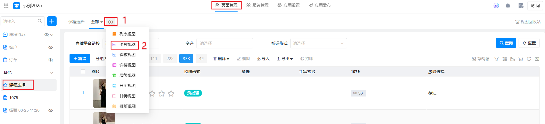 在视图栏上面的「 + 」 按钮,选择视图类型(卡片视图)创建一个新的列表视图,默认显示所有数据和字段。
