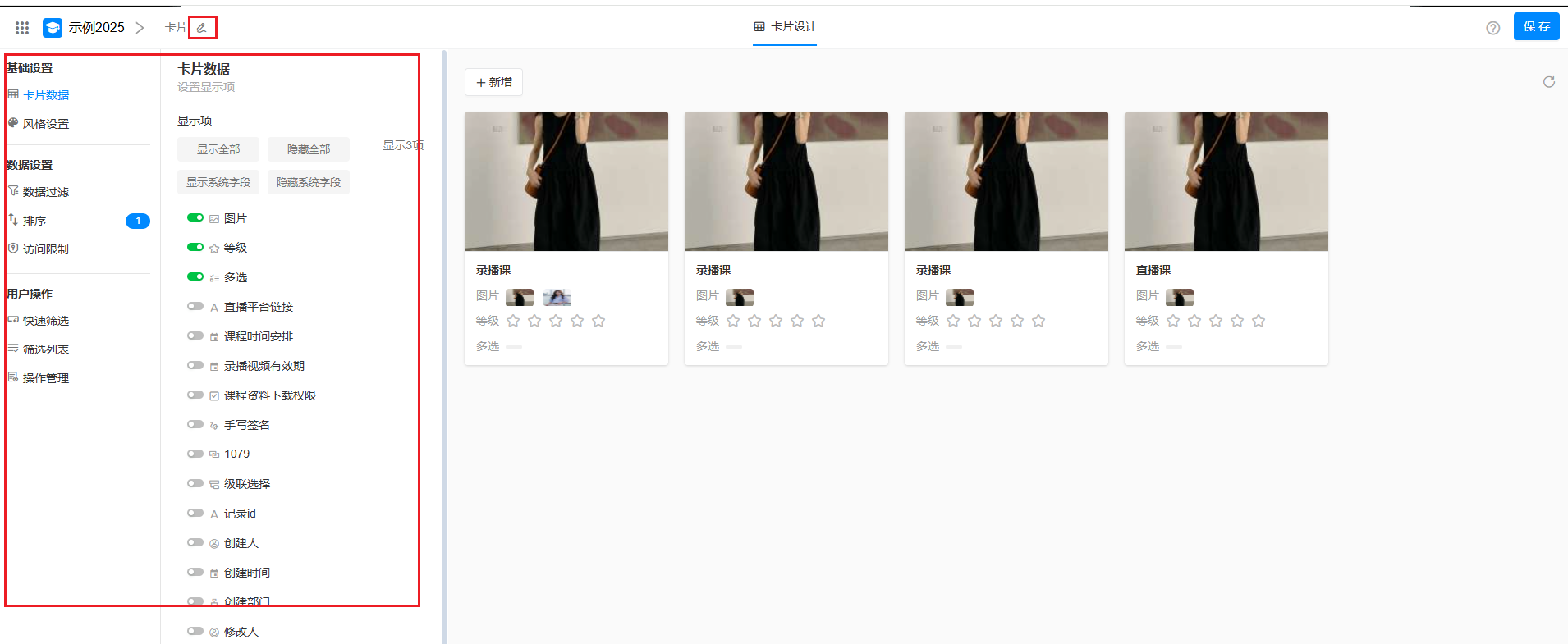 左侧主要通过基础设置(卡片数据、风格设置)、数据设置(数据过滤、排序、访问限制)、用户操作(快速筛选、筛选列表、操作管理)。