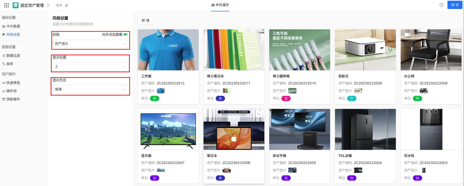 以卡片的形式展示数据内容,把数据里面的图片字段作为卡片封面,重点突出图片内容,在封面图下面还可以配置数据的其他字段显示