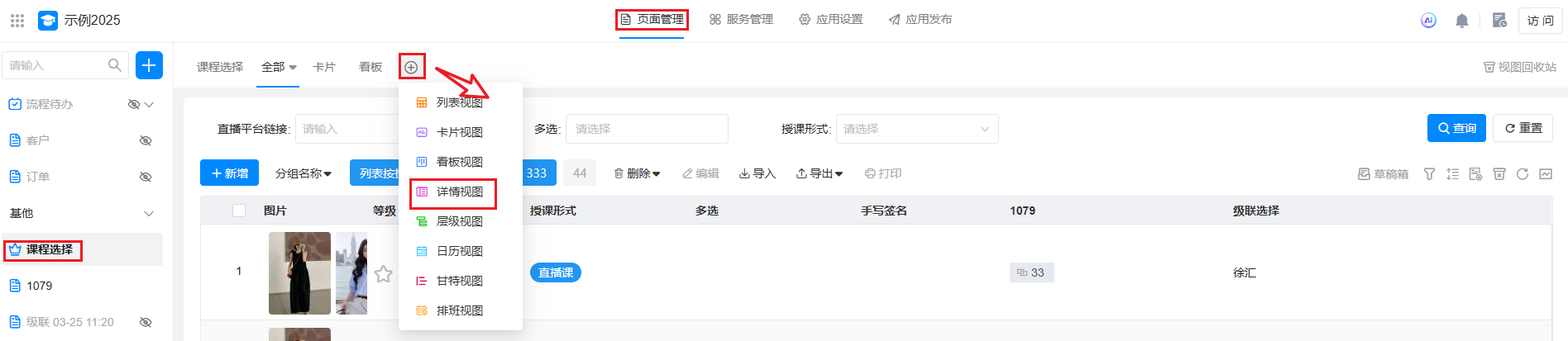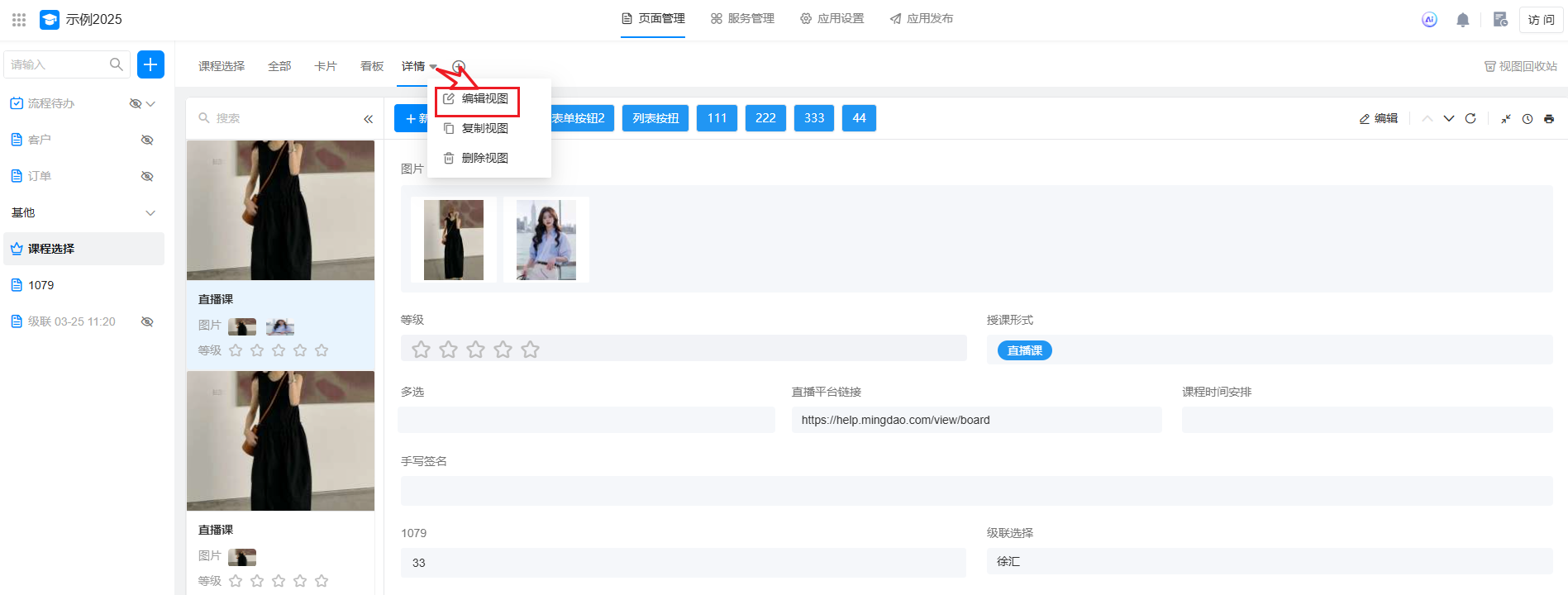 点击视图栏上面的详情视图,选择「编辑视图」,进入详情视图编辑页面。
