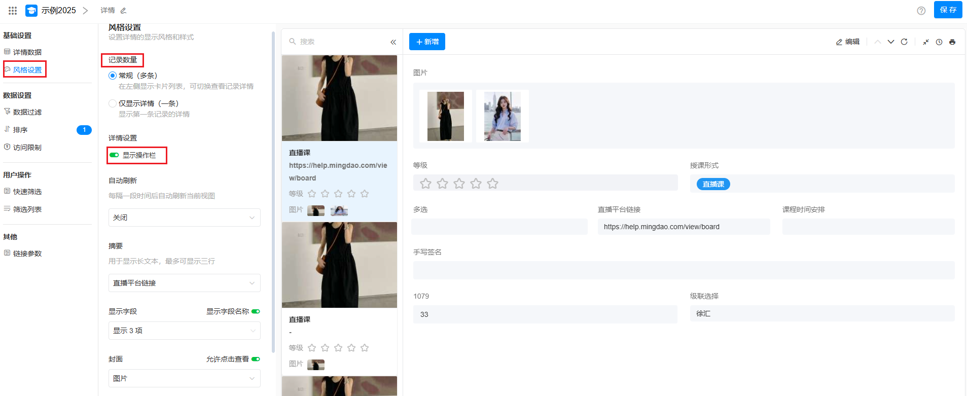 显示操作栏 显示记录详情时,可以设置是否显示记录上方的操作栏