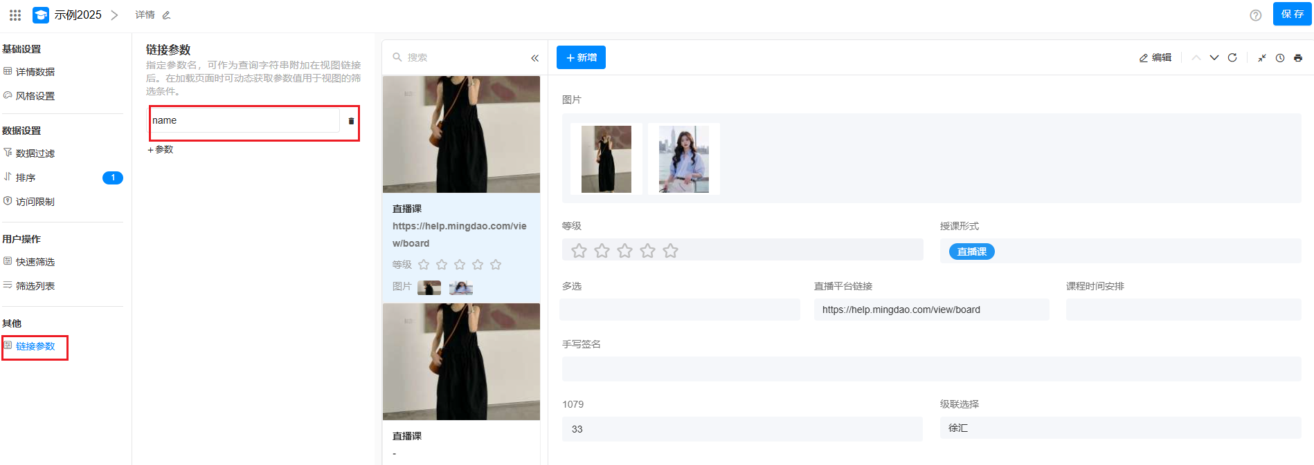 3、详情视图中筛选设置为链接参数