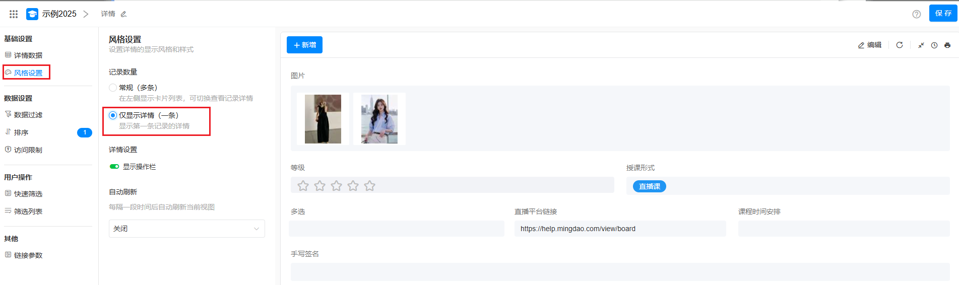 在详情视图中,可以直接展开记录的详情页面,而不需要通过弹窗或新开页面才能查看记录的全部信息。 在视图中,可以显示多条记录,选中记录后右侧显示其详情信息,也可以仅显示视图中的第1条记录,打开视图时直接显示此记录的详情页面。