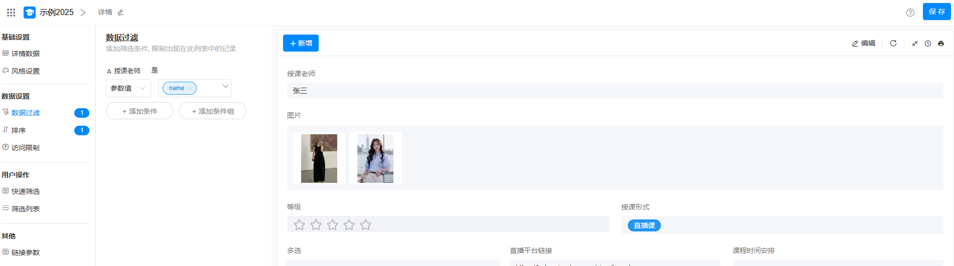 左侧主要通过基础设置(详情数据、风格设置)、数据设置(数据过滤、排序、访问限制)、用户操作(快速筛选、筛选列表)、其他(链接参数)。