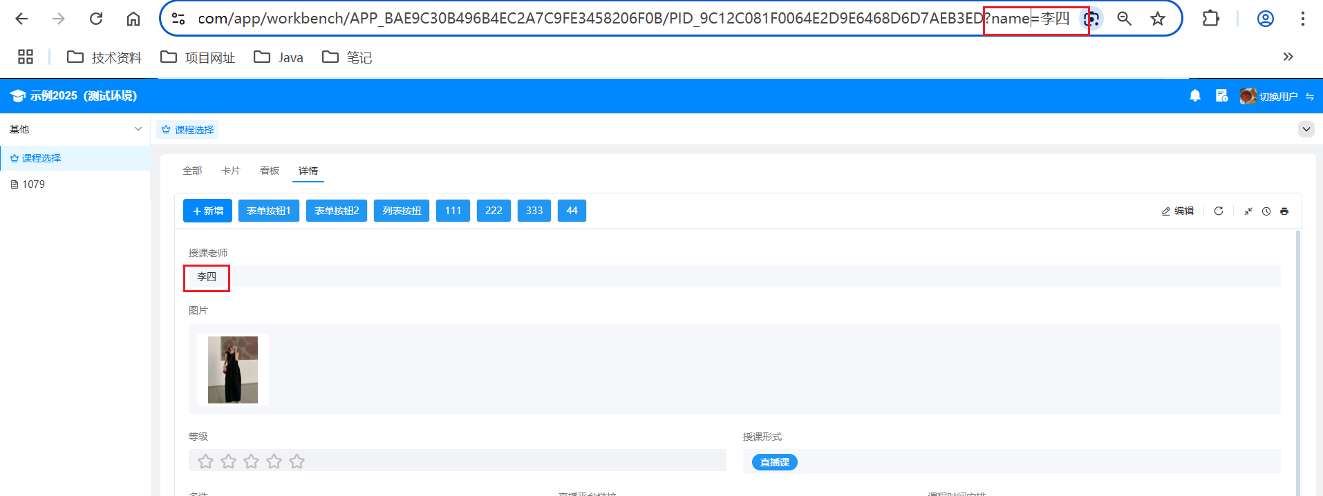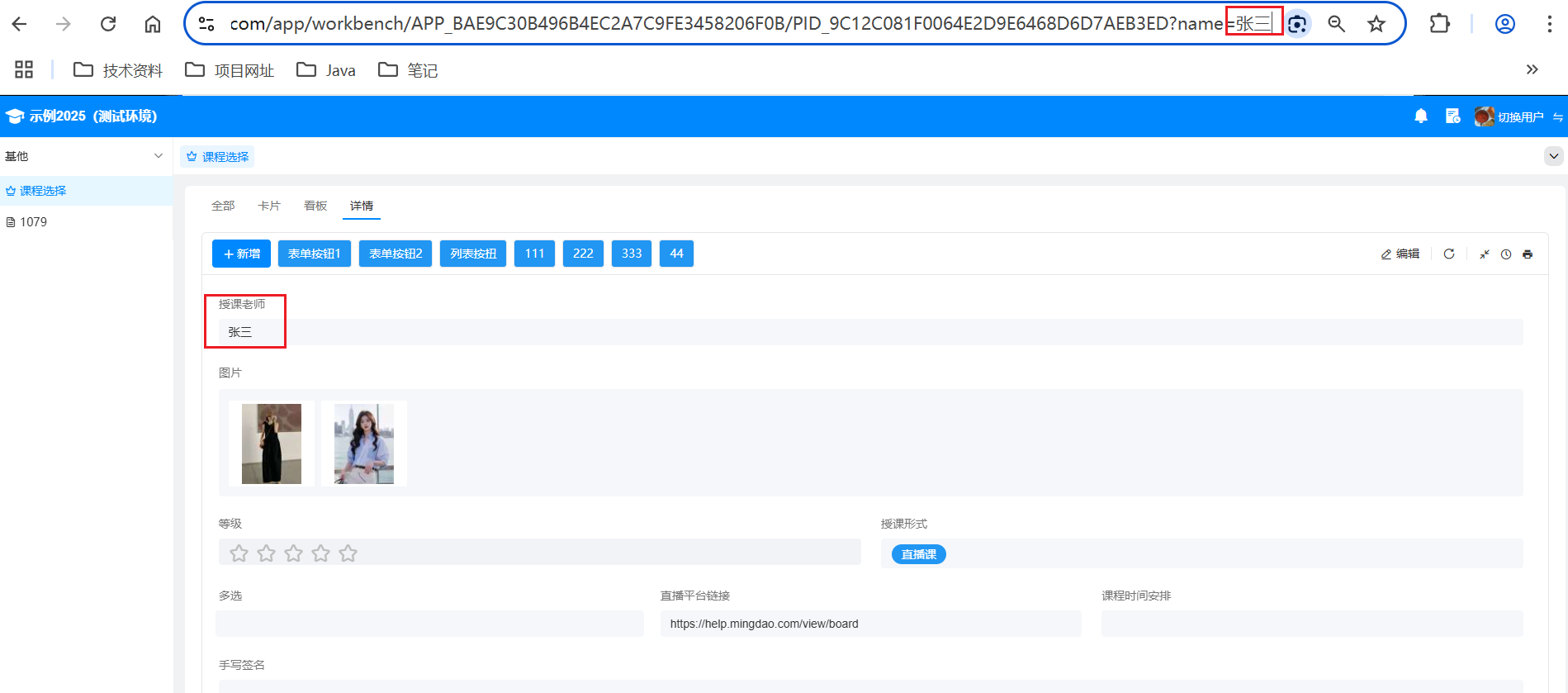 4、拼接视图的URL 在应用内通访问视图获取视图的对应链接,在链接中加上?name=李四,最终显示效果: