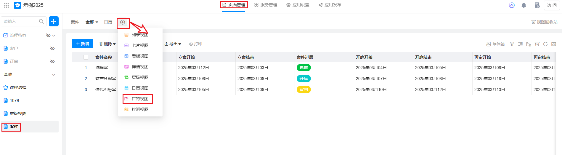 在视图栏上面的「 + 」 按钮,选择视图类型(甘特视图)。