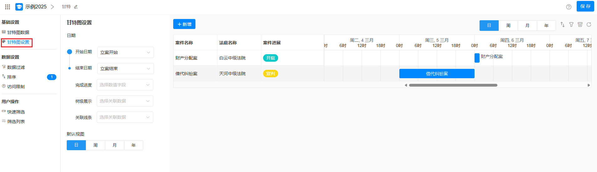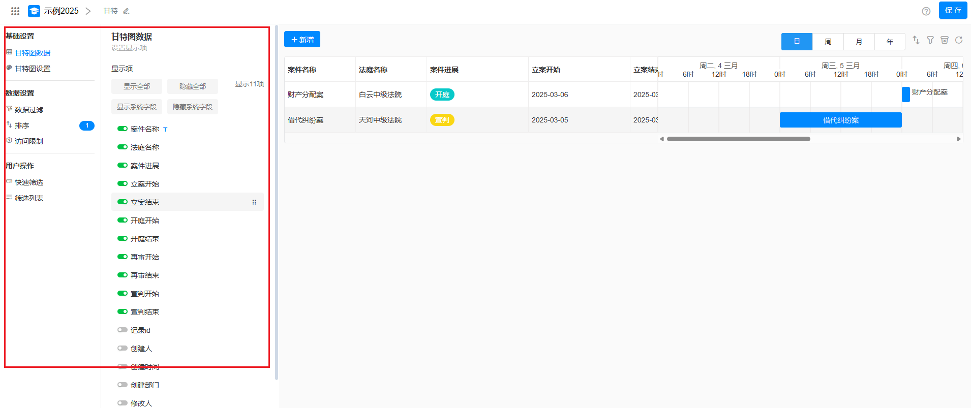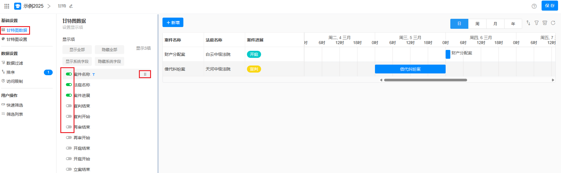 左侧主要通过基础设置(甘特图数据、甘特图设置)、数据设置(数据过滤、排序、访问限制)、用户操作(快速筛选、筛选列表)。