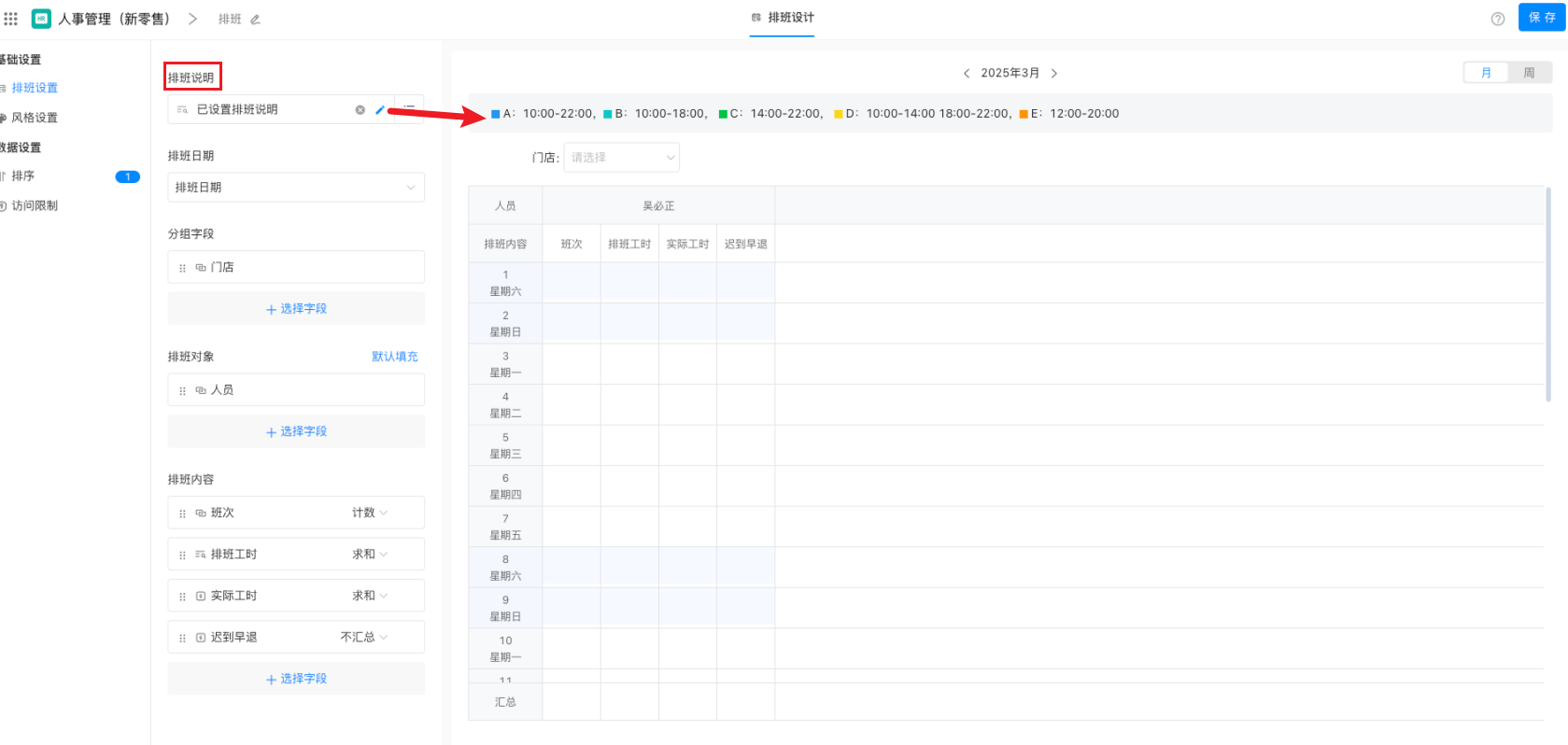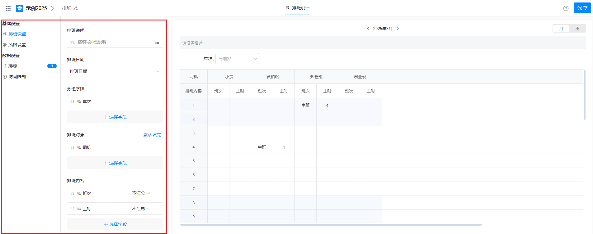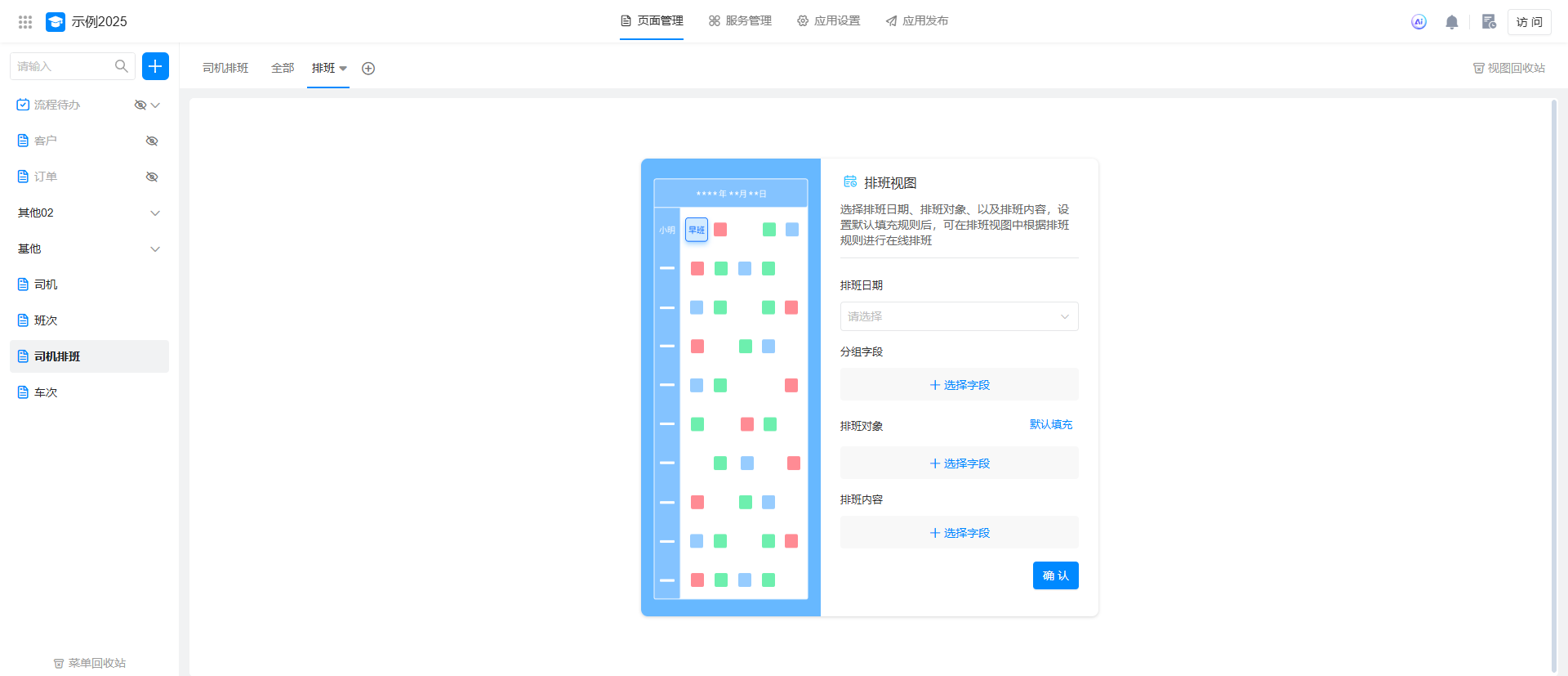 | 排班内容 | 必填,支持关联数据、关联字段、文本、数值字段 |