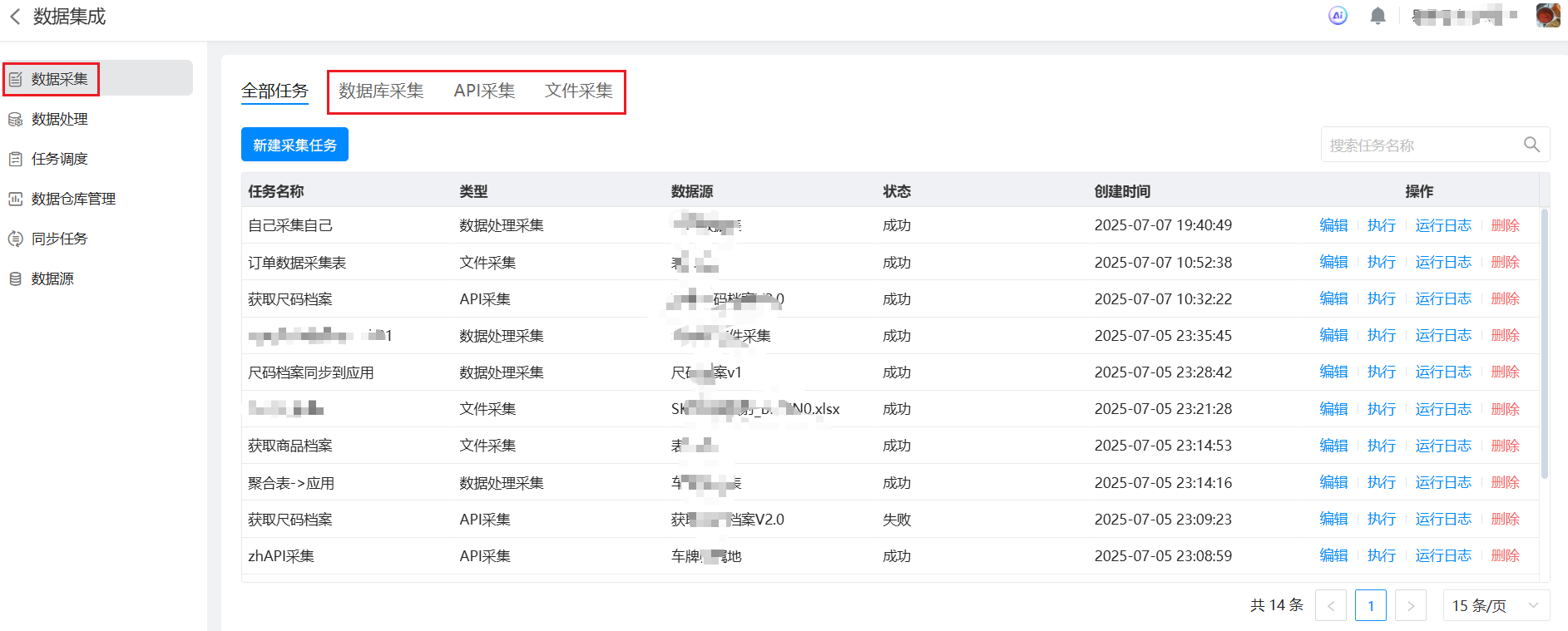 数据采集是数据集成的起点,支持从多种数据源获取数据,为后续的数据处理和分析提供丰富的数据基础。 本模块提供三种标准化采集方式:数据库 采集、API采集和文件采集,以满足不同业务场景下的数据接入需求。