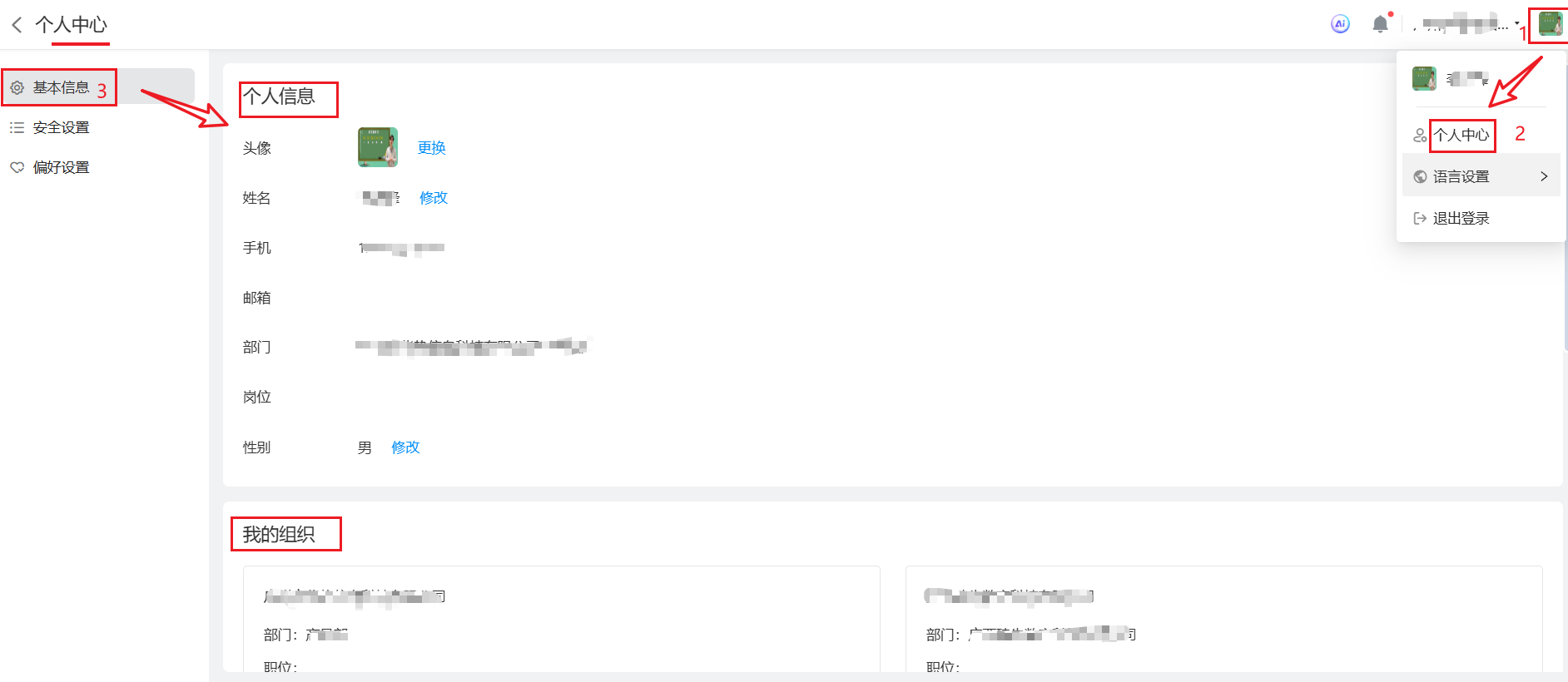 个人中心的基本信息是对个人信息的基本设置。个人可以点击右上角「用户菜单 >> 个人中心 」,修改个人信息。
