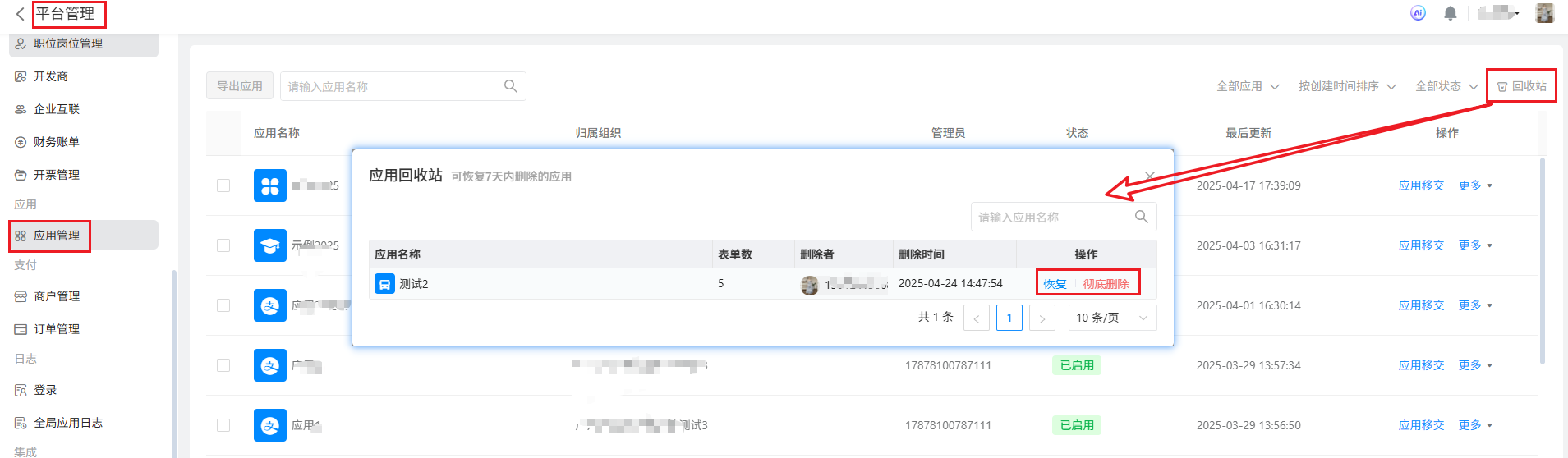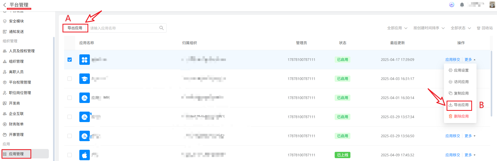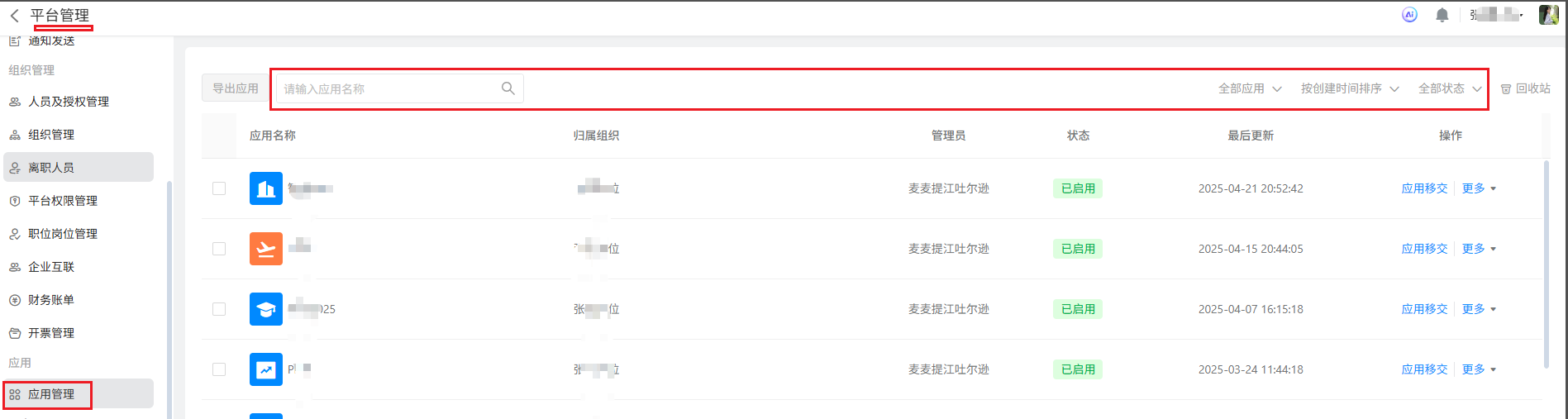 平台管理员点击「 首页 》平台管理 》应用管理 」进入应用管理页面。