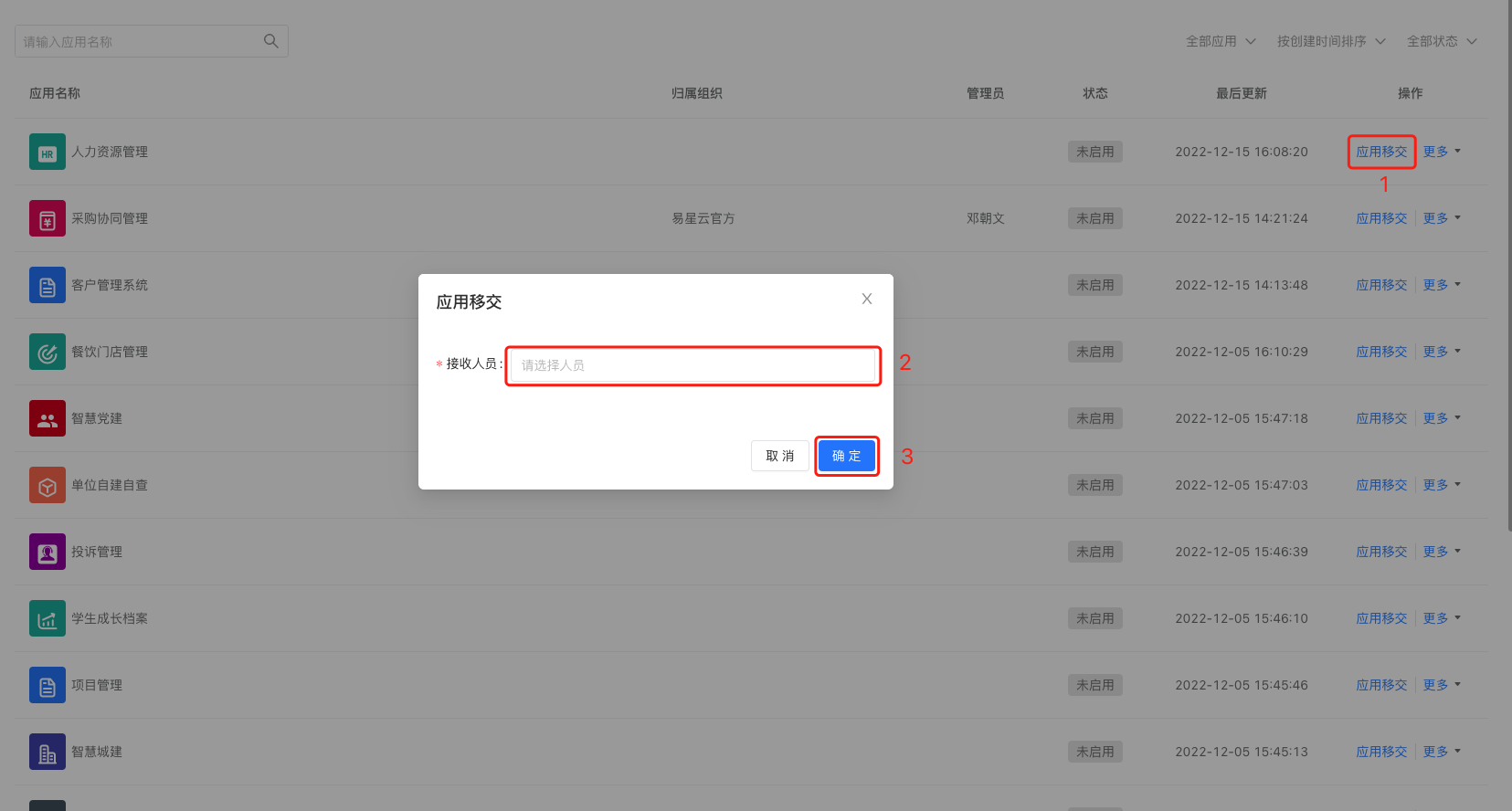 在应用列表的右侧操作栏,点击“应用移交”按钮,打开应用移交弹窗,选择接收人员,点击右下角的”确认“按钮完成应用移交,应用移交后,原来的应用管理员移除掉,接收人员将成为应用的管理员。