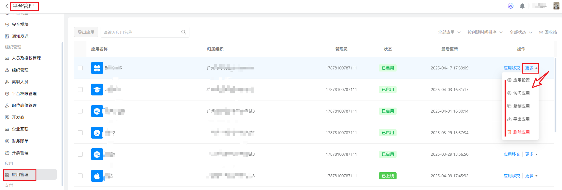 在应用列表的右侧操作栏,点击“更多”按钮,可以选择应用设置、访问应用、复制应用、导出应用、删除应用。