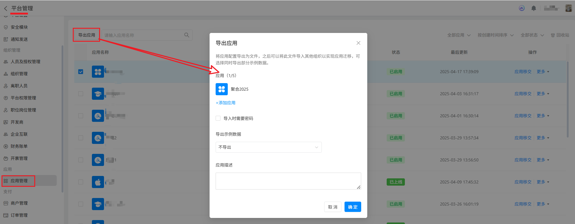 组织管理员在组织管理后台中的"应用管理"中,将应用进行导出。批量导出多个应用时为一个导出文件,导入时则一次导入多个应用。