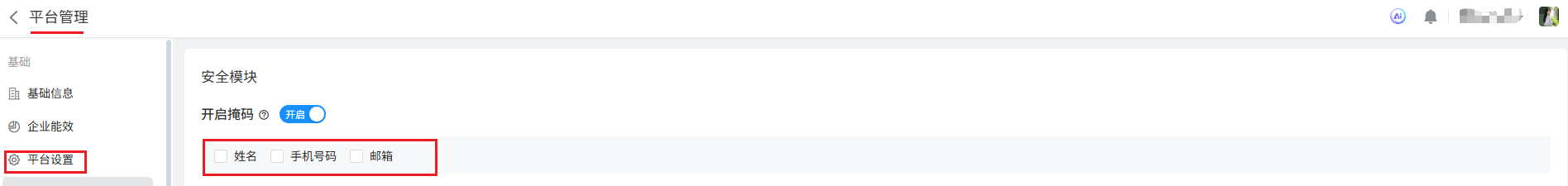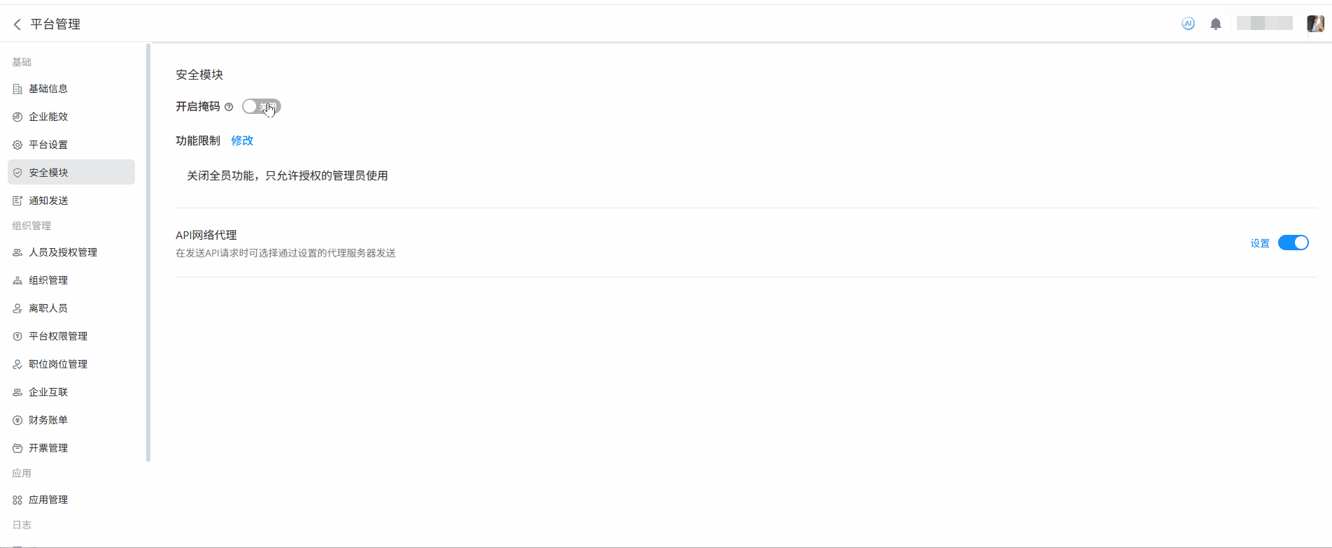 平台管理基础安全模块本页总览安全模块 安全模块是平台管理的核心组件,负责保障系统访问安全、数据权限控制和网络通信安全,通过灵活的配置策略满足企业级安全需求。 功能路径 平台管理员点击「 首页》平台管理》安全模块 」进入功能页面。 开启编码 开启掩码后,根据配置掩盖用户(姓名、手机号码、邮箱)敏感信息 演示效果 功能限制 可关闭非必要功能,仅允许特定管理员访问,减少攻击面。 API网络代理 为外发API请求配置代理服务器,隐藏真实IP并增强请求安全性。 适用场景:跨地域访问、防止API被恶意拦截。