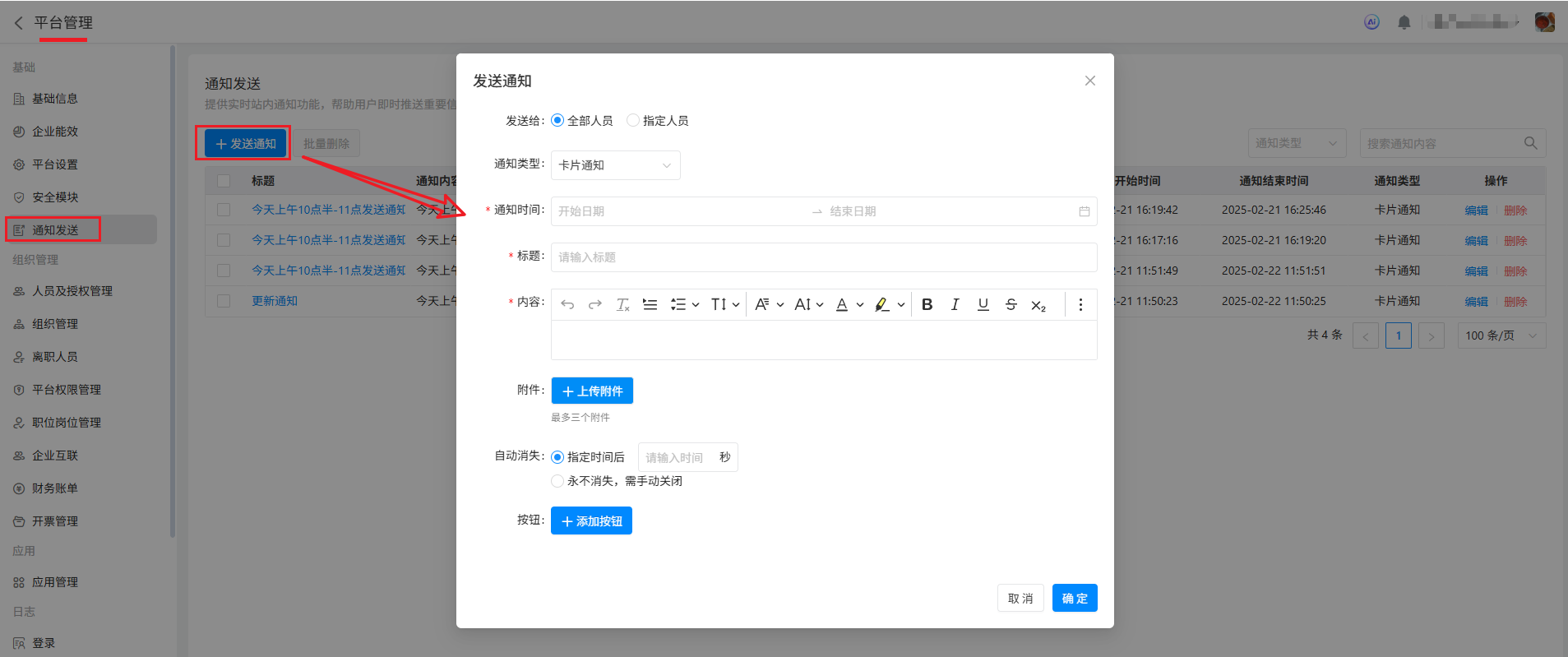 平台管理员点击「 首页 》平台管理 》通知发送 」进入通知发送页面。