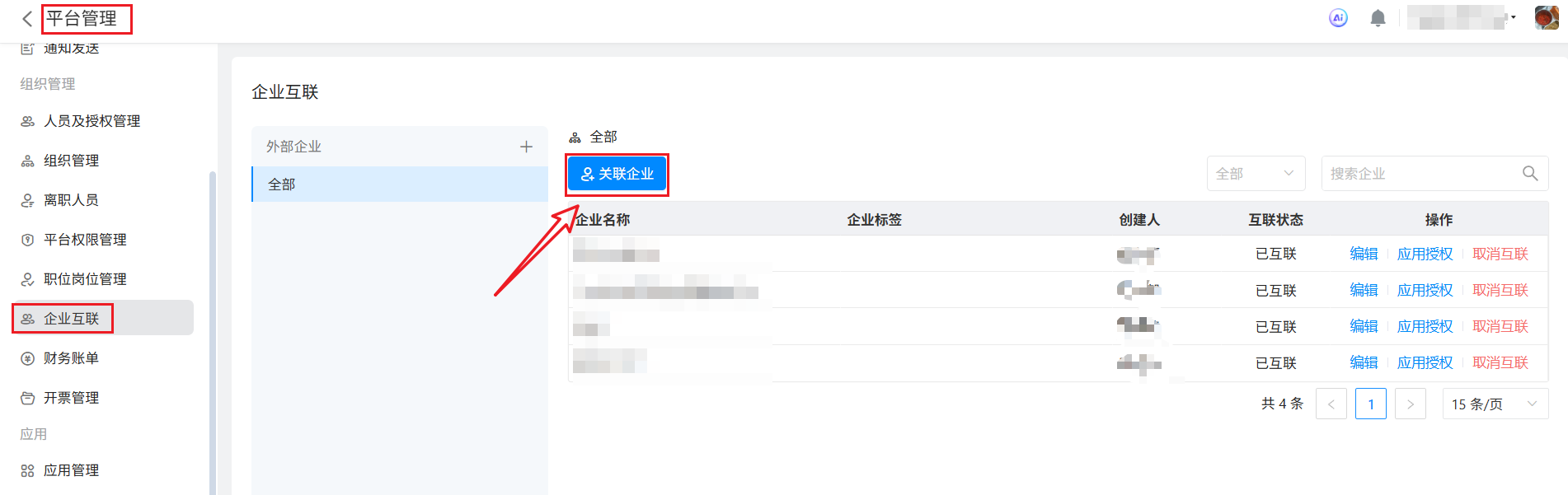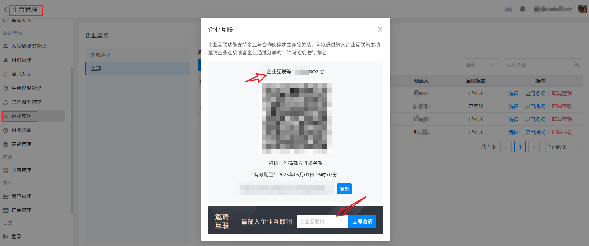 | 主动邀请连接 | 1. 输入目标企业的企业互联码 2. 发送邀请,对方确认后建立连接 | 已知明确合作伙伴 需精准绑定特定企业 | 定向邀请,安全性高 需提前获取对方互联码 |