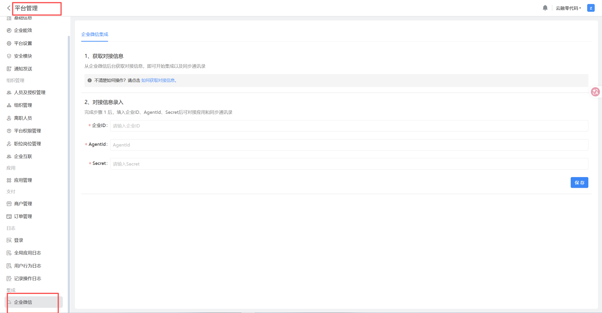 平台管理员点击「 首页 》平台管理 》 企业微信 」进入企业微信页面。