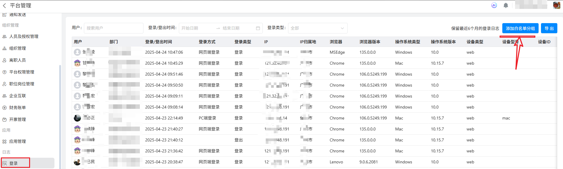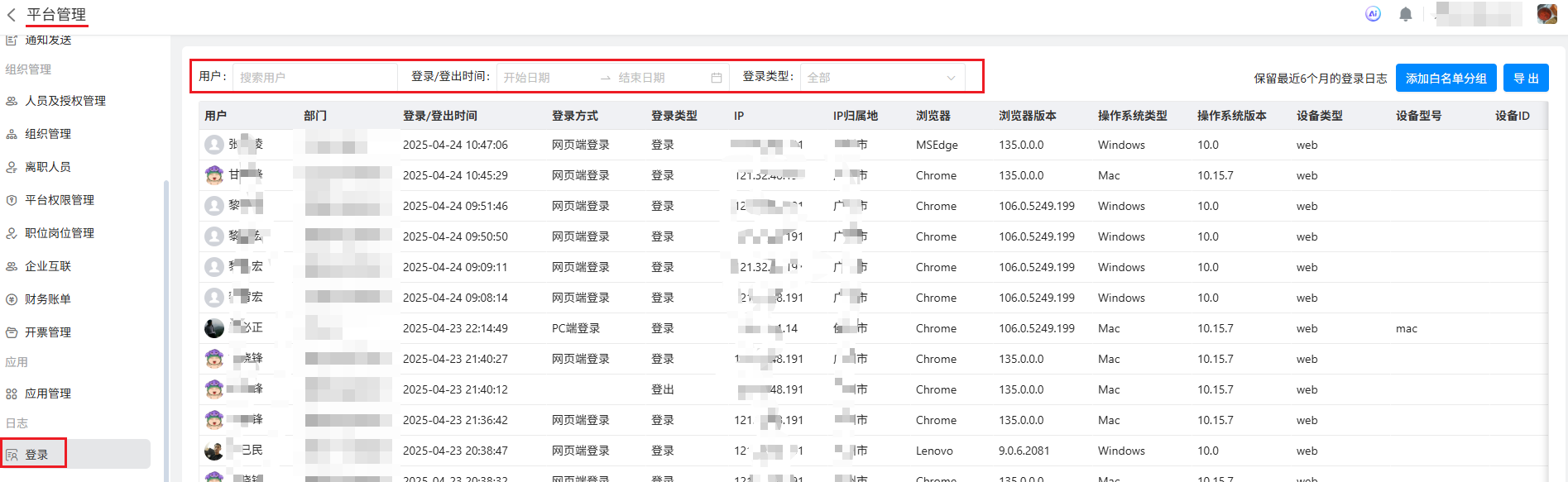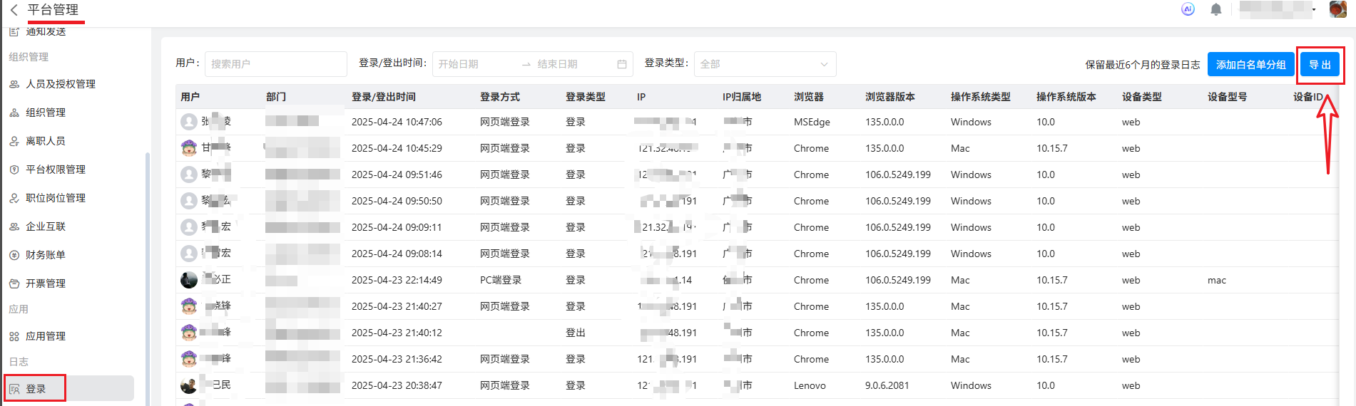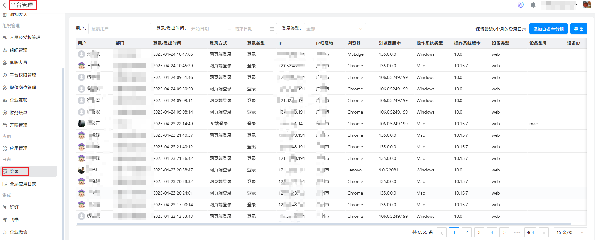 登录日志记录的是企业成员的登录明细情况,记录了登录人、登录时间、登录地、登录平台以及登录的 IP 地址。