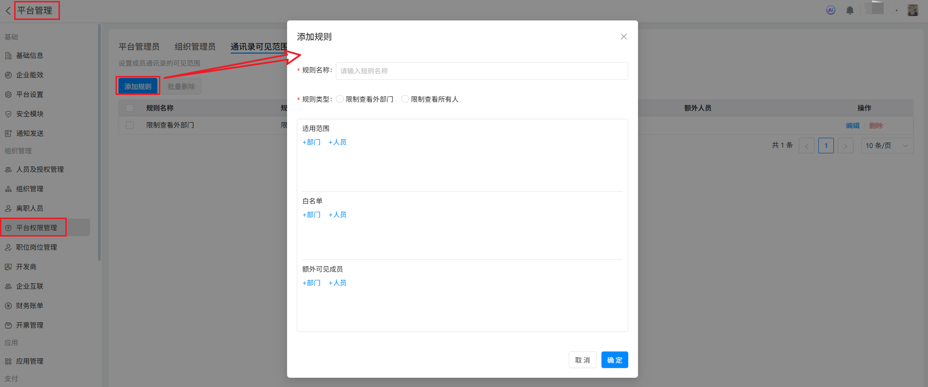 点击「 首页 》平台管理 》平台权限管理 》通讯录可见范围 」功能页面。