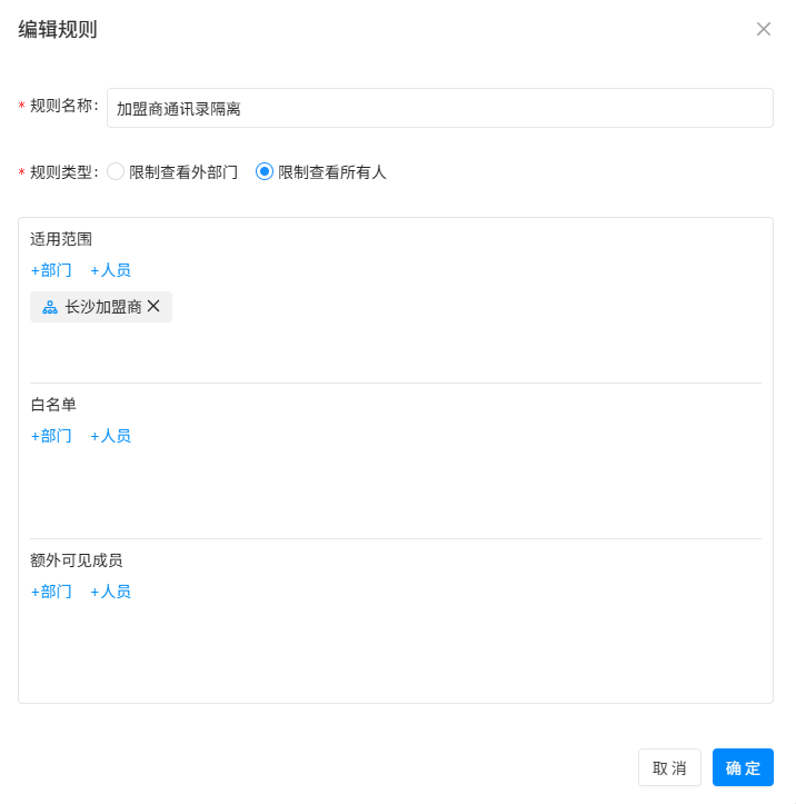- 白名单:如果限制的范围选择了部门或者组织角色,那么再选择一个小范围内的人员设置为白名单,白名单的人不受查看规则限制。