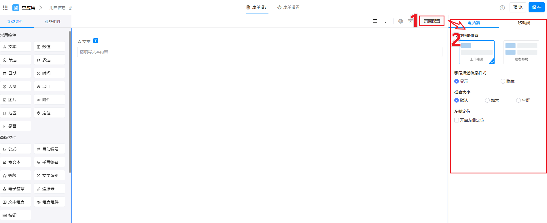 在「页面配置」中可以 设置字段标题位置、字段描述信息样式、弹出大小、是否开启左侧定位。