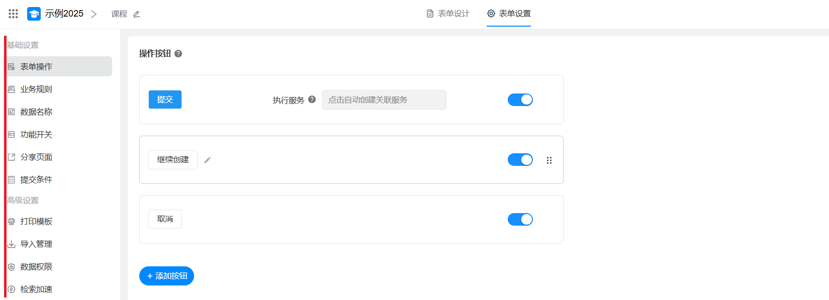 表单设置包含了「表单操作」、「业务规则」、「数据名称」、「功能开关」、「分享页面」、「提交条件」、「打印模板」、「导入管理」、「数据权限」、「检索加速」,您可阅读相关文档进一步了解他们的详细内容与设置方法。