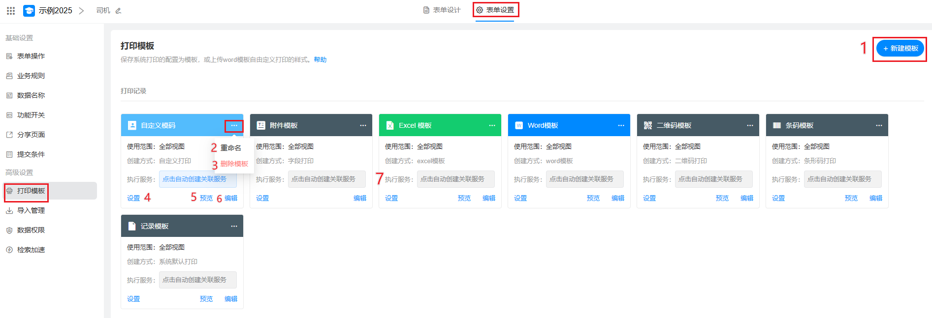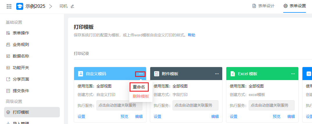 打开「打印模板」管理页面,找到需要重命名的模板,点击右侧的「...」选择「重命名」