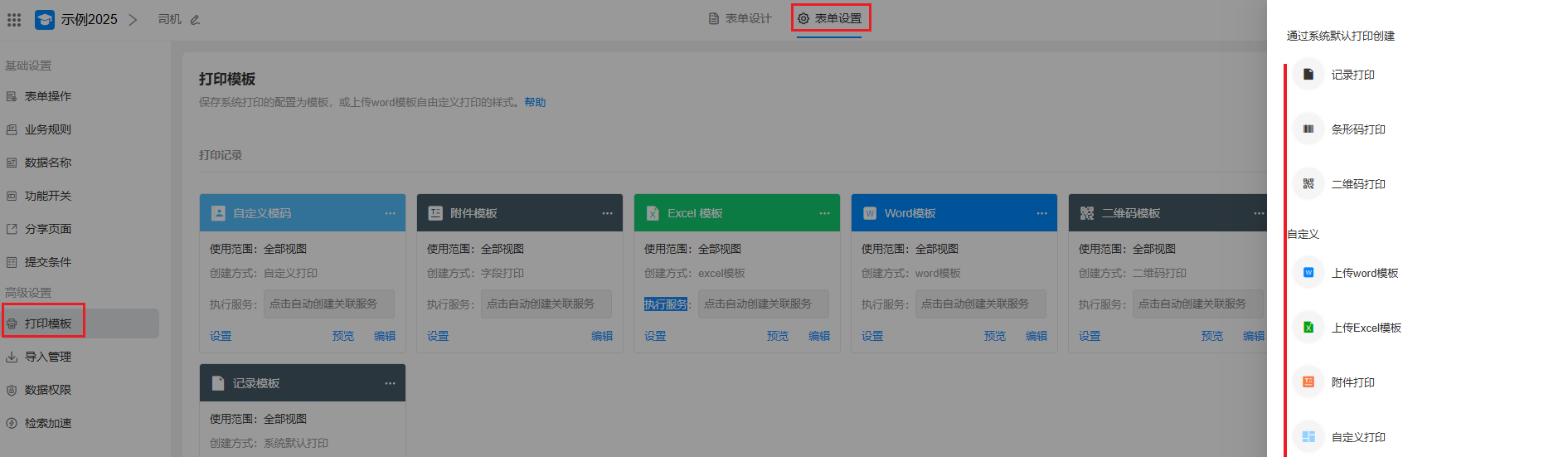 打开「打印模板」管理页面 ,点击「新建模板」按钮选择需要设计模板类型,完成相关配置点击「保存」按钮完成新增。