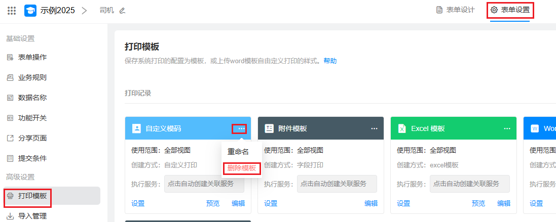 打开「打印模板」管理页面,找到需要删除的模板,点击右侧的「...」选择「 删除模板」