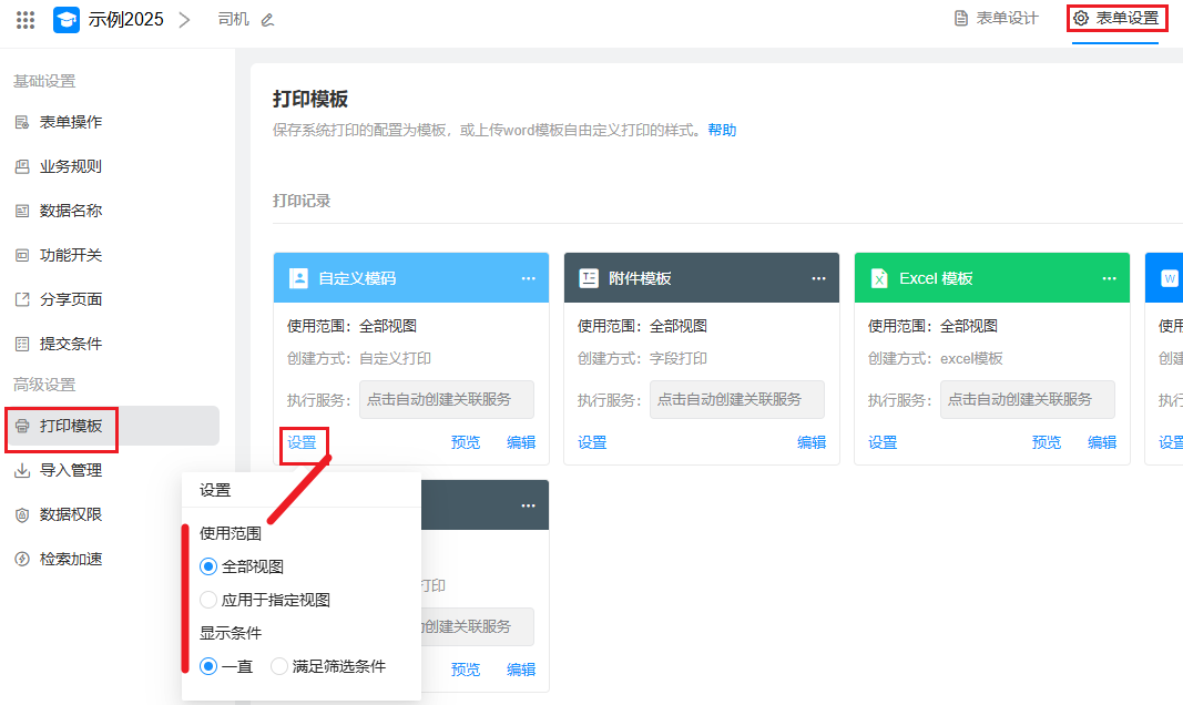 有时打印模板并不需要在每个视图下都显示,可以设置使用范围。 打开「打印模板」管理页面,找到需要删除的模板,点击左下角的「设置」 点击"使用范围",可以指定只有选择的视图下的记录才能使用此模板打印。